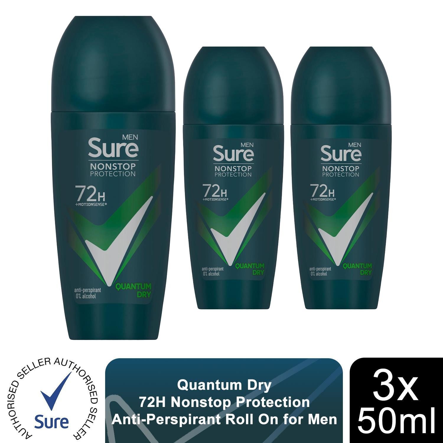 Sure Men Antiperspirant Deo Roll On 72H Nonstop Protection Quantum Dry 50ml, 3pk