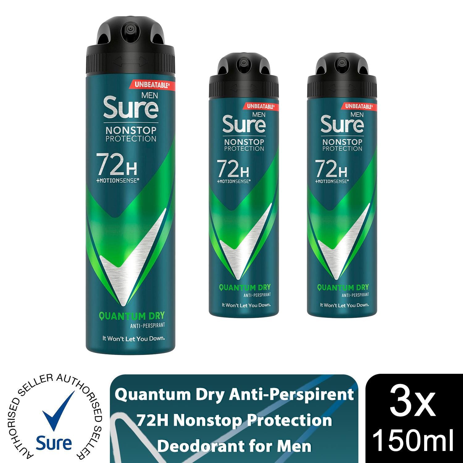 Sure Men Nonstop Protection 72H Anti-Perspirant Deodorant Quantum Dry 150ml, 3pk