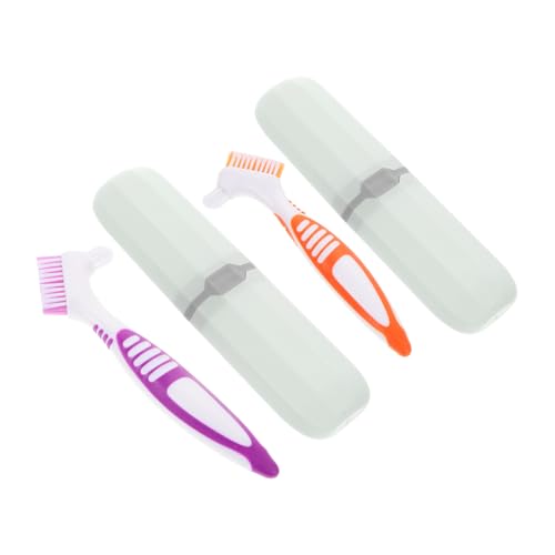 Gatuida 2 Sets Portable Denture Brush with Travel Toothbrush Containers Personal Oral Care Tool with Ergonomic Handles Smooth Surface Denture Cleaner for Thorough Cleaning Travel Kit