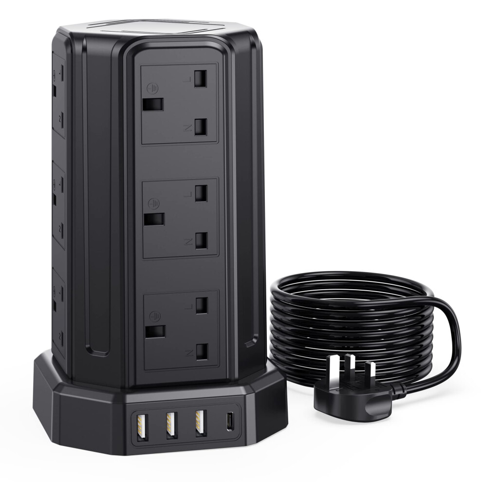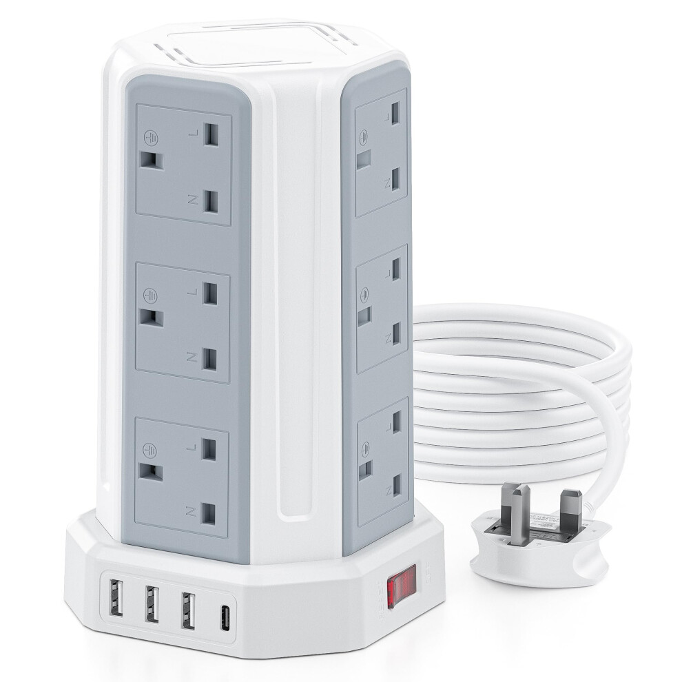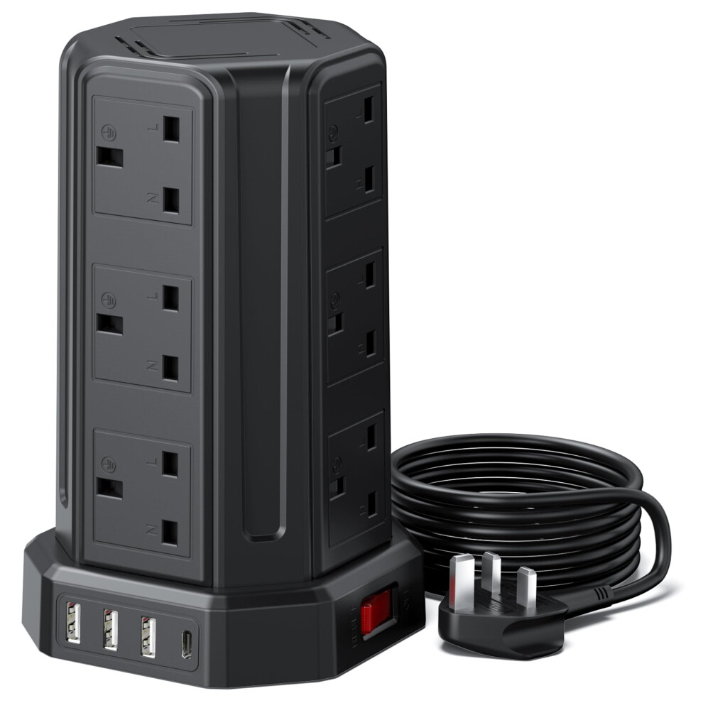 Tower Extension Lead 5M, 12 Way Outlets Multi Plug Extension Tower with 4 USB Slots (1 Type C & 3 USB Ports), Surge Protector Long Extension Lead