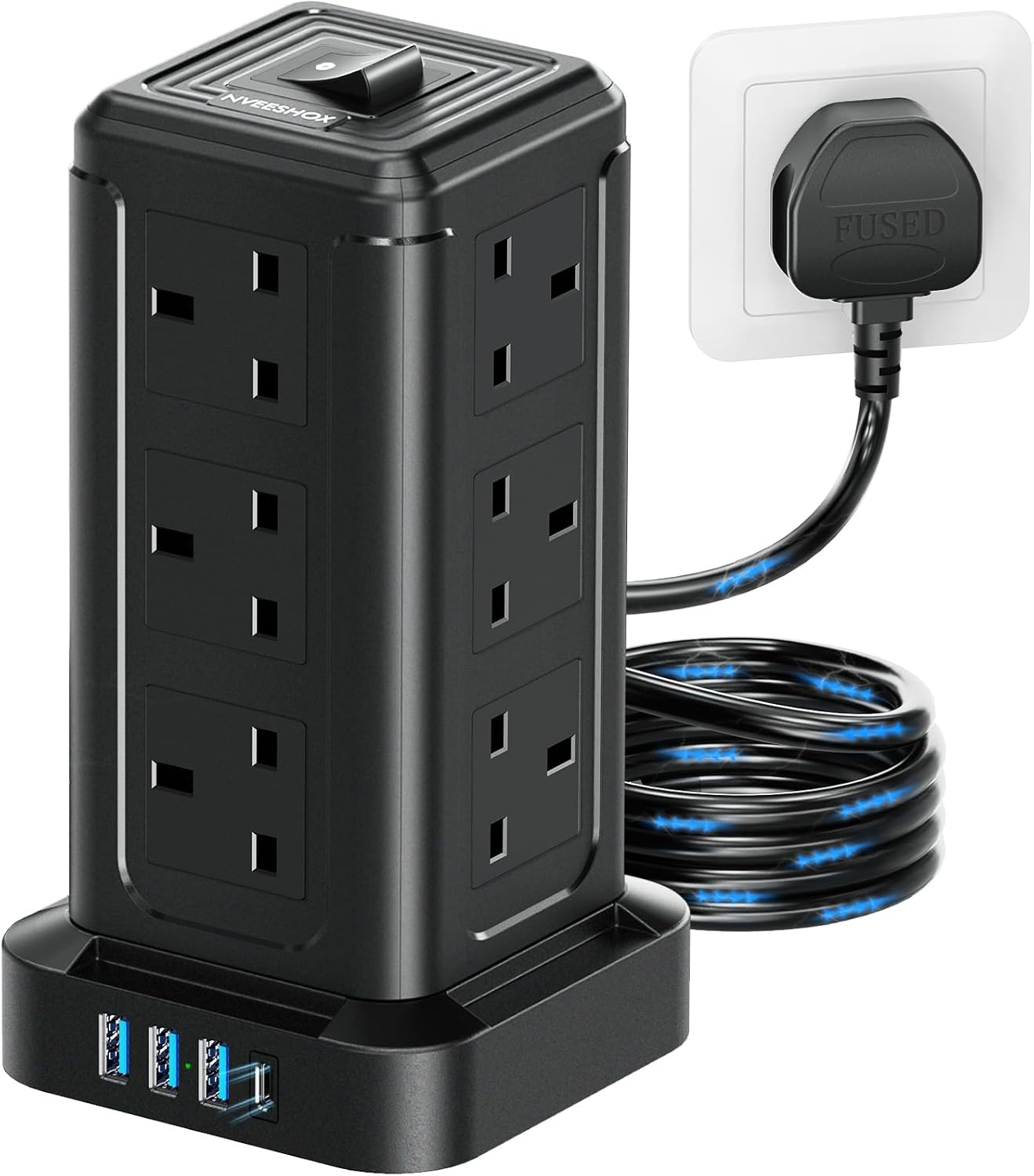 Tower Extension Lead 5M, [13A 3250W] 12 Way Extension Tower Multi Plug Extension Sockets with 4 USB Slots, Surge Protector Extension Cable 5M for Hom