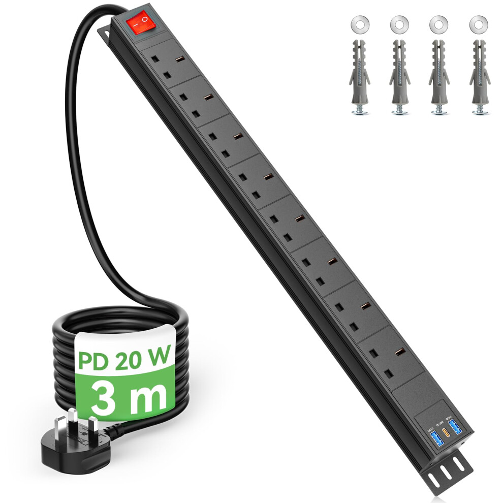 3m Cable 8 Way Power Strip Surge Protector, 8 Way Extension Lead USB C PD20W with Switches, Wall Mount Power Strip with Metal Casing for Home Office