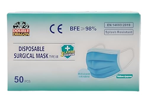 Double Dragon British Brand 3-Ply Type IIR Disposable Surgical Face Mask | EN14683:2019 Certified | 98% Filtration, Fluid-Resistant, Medical-Grade Mask with Black Ear Loops – Pack of 50