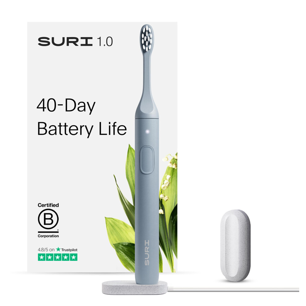 SURI Sustainable Sonic Toothbrush - Slim and Powerful Electric Toothbrush, Recyclable Plant-Based Head, 2 Modes, IPX7 Waterproof, Including
