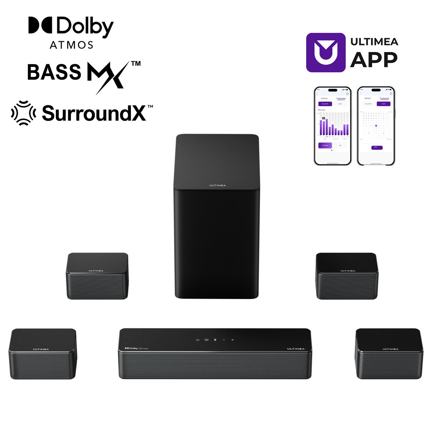 ULTIMEA 5.1ch Sound Bar w/Dolby Atmos, Surround Sound System for TV, App Control, Home Theater Sound System, TV Soundbar with Subwoofer, 2 Surround S