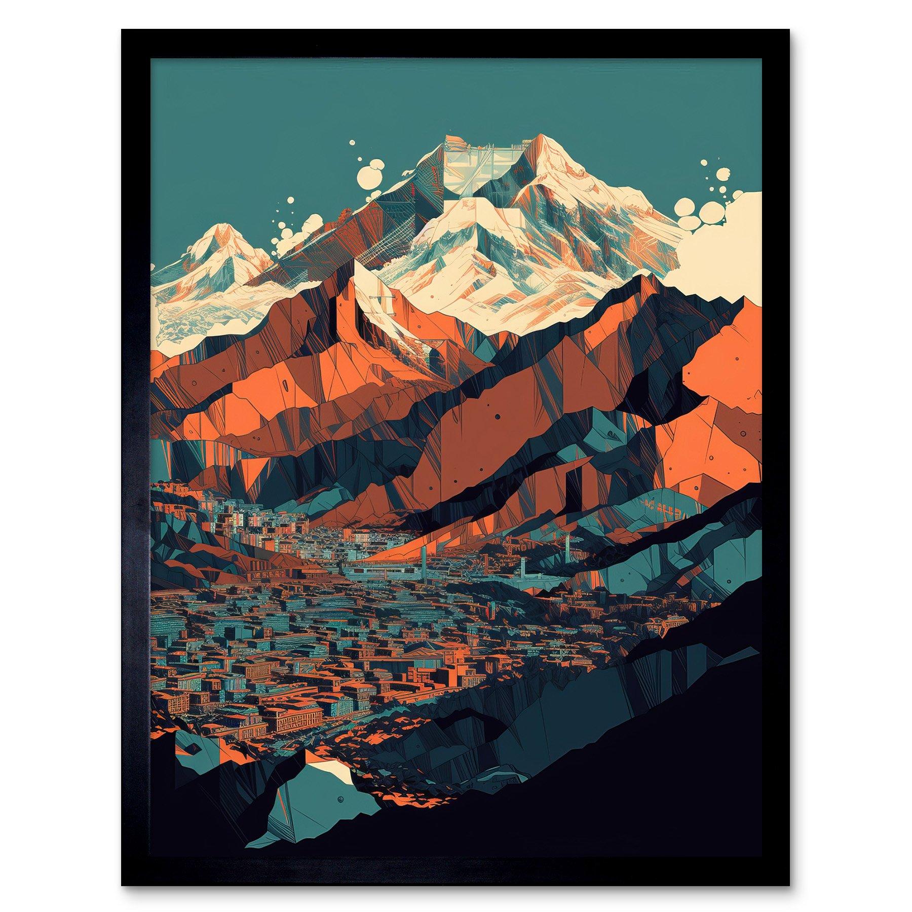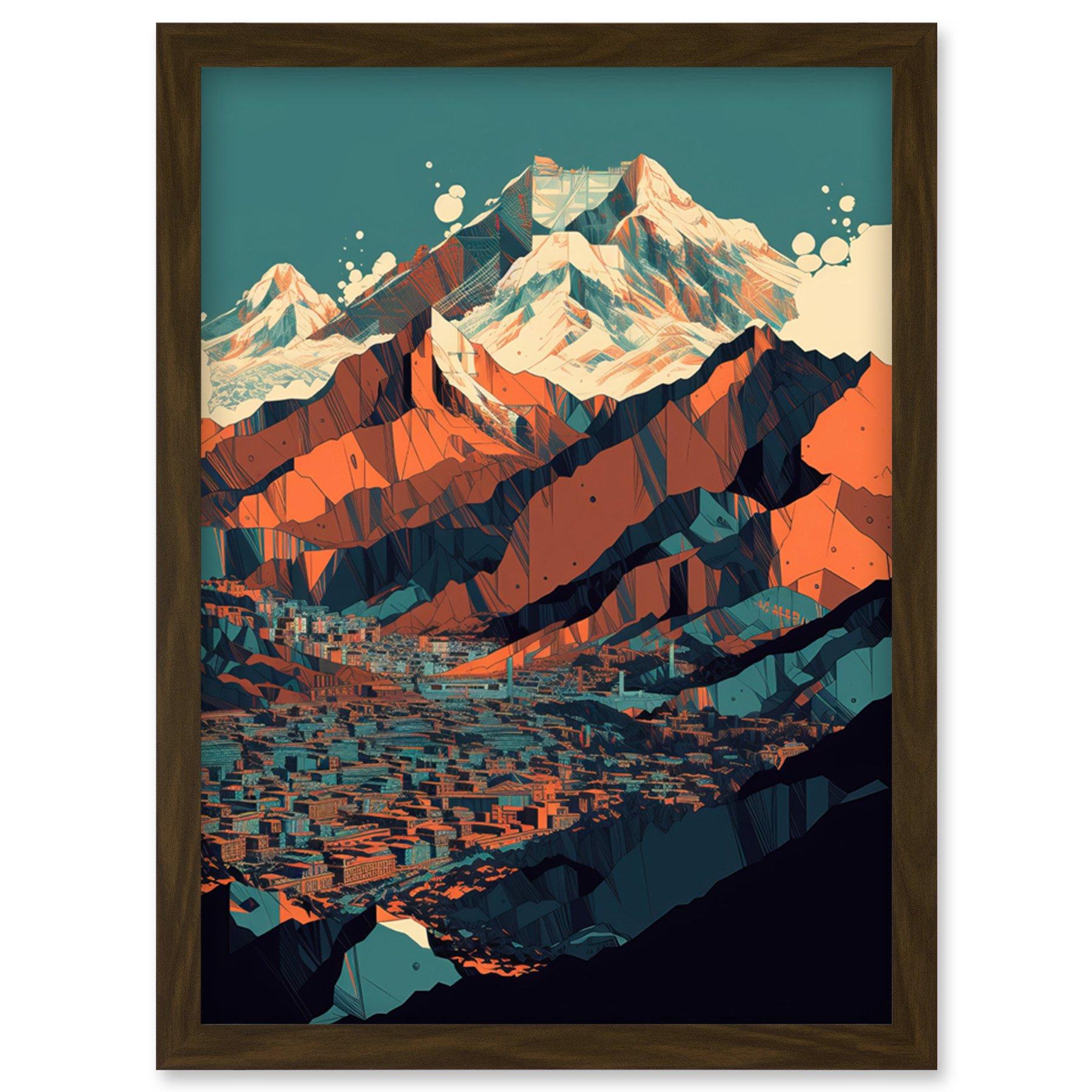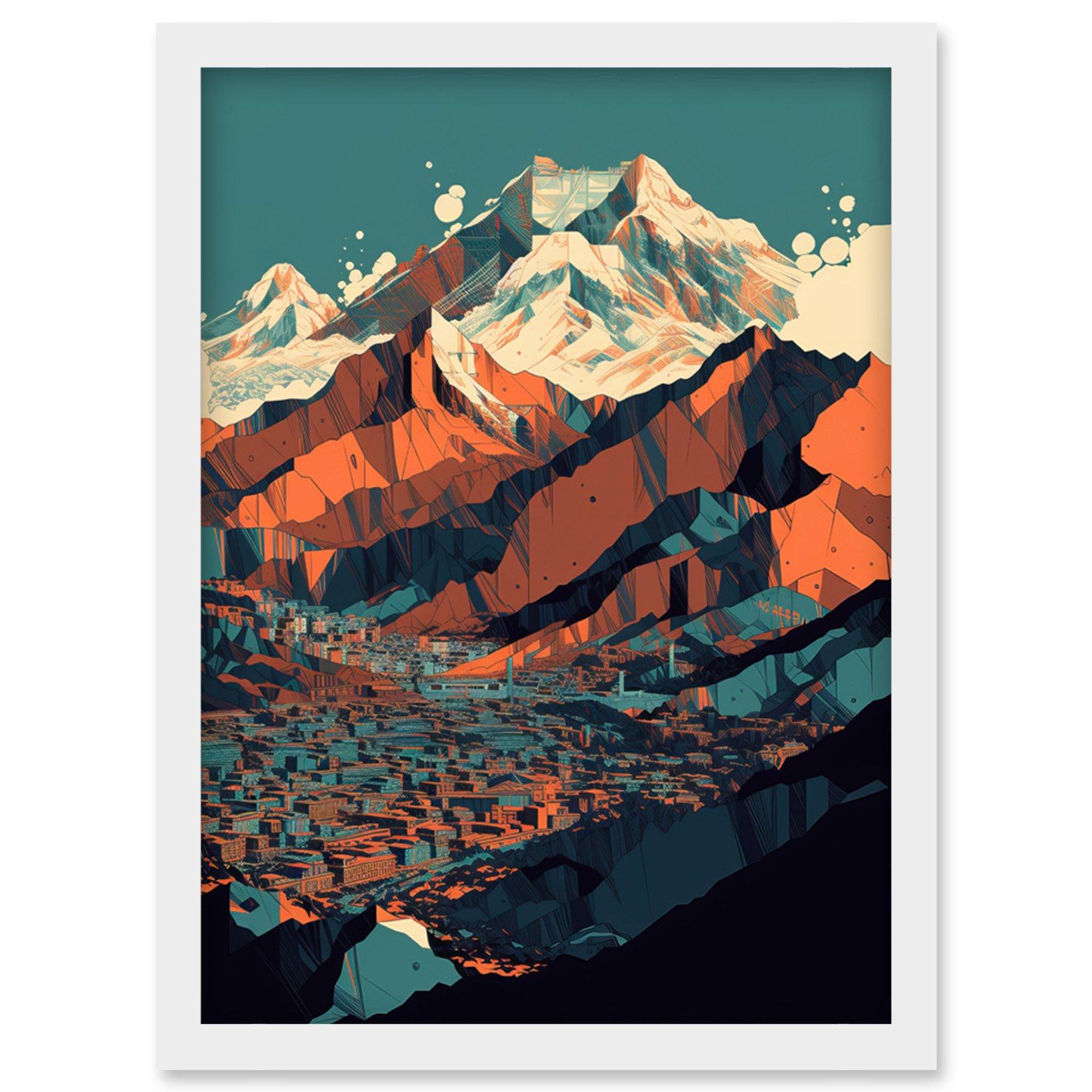 Modern City Surrounded by Tall Mountains Landscape Artwork Framed Wall Art Print A4