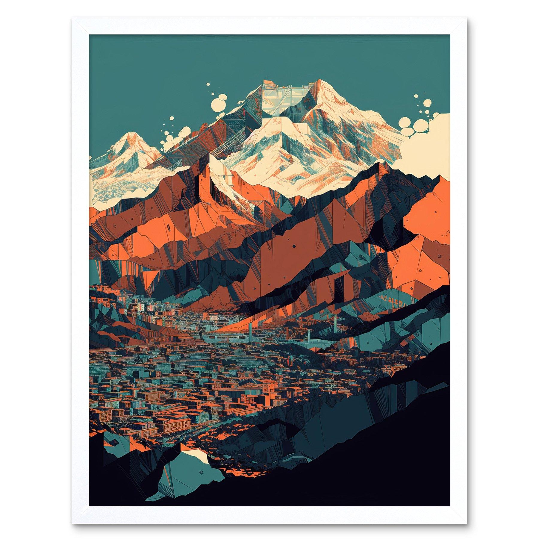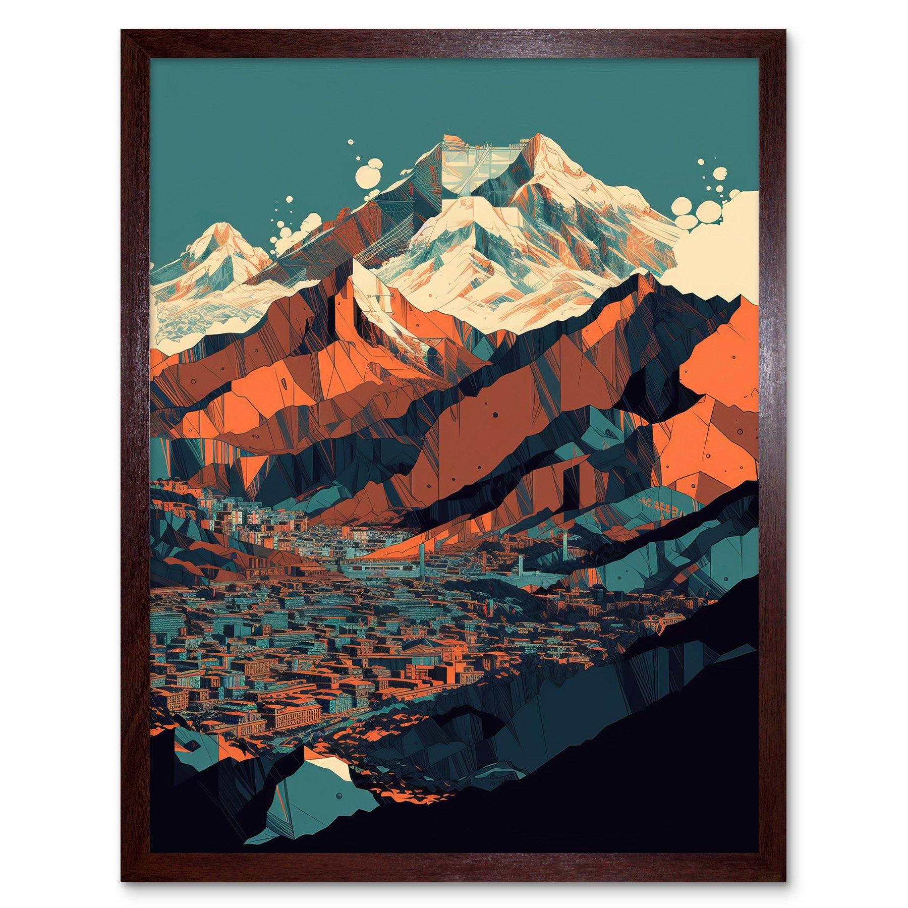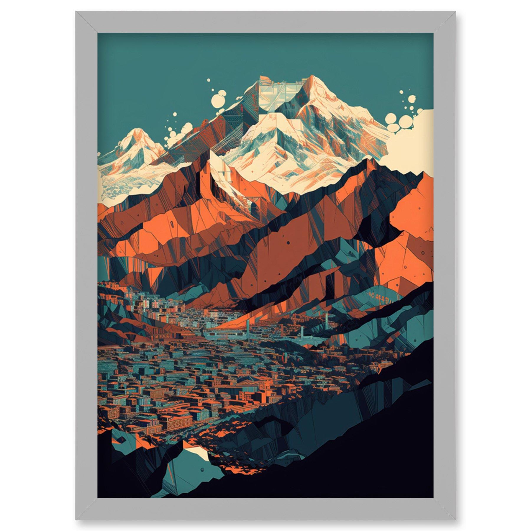 Modern City Surrounded by Tall Mountains Landscape Artwork Framed Wall Art Print A4