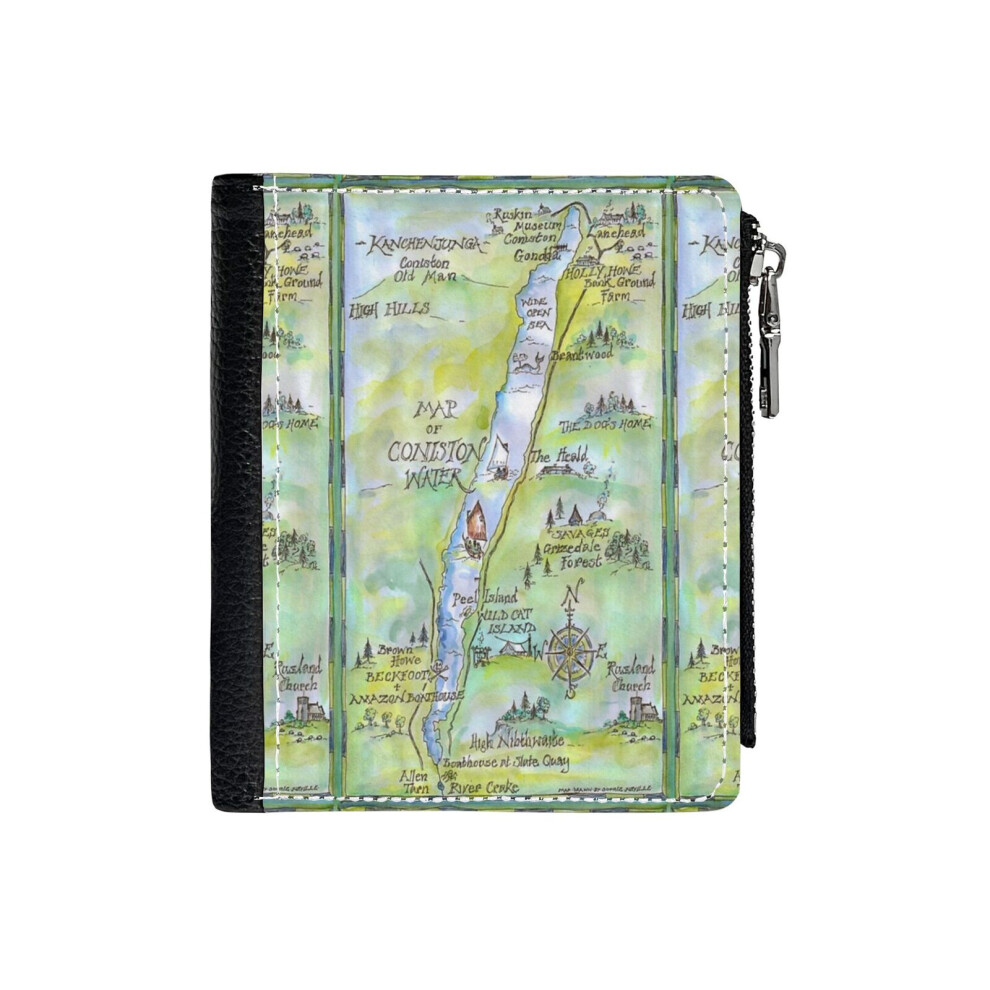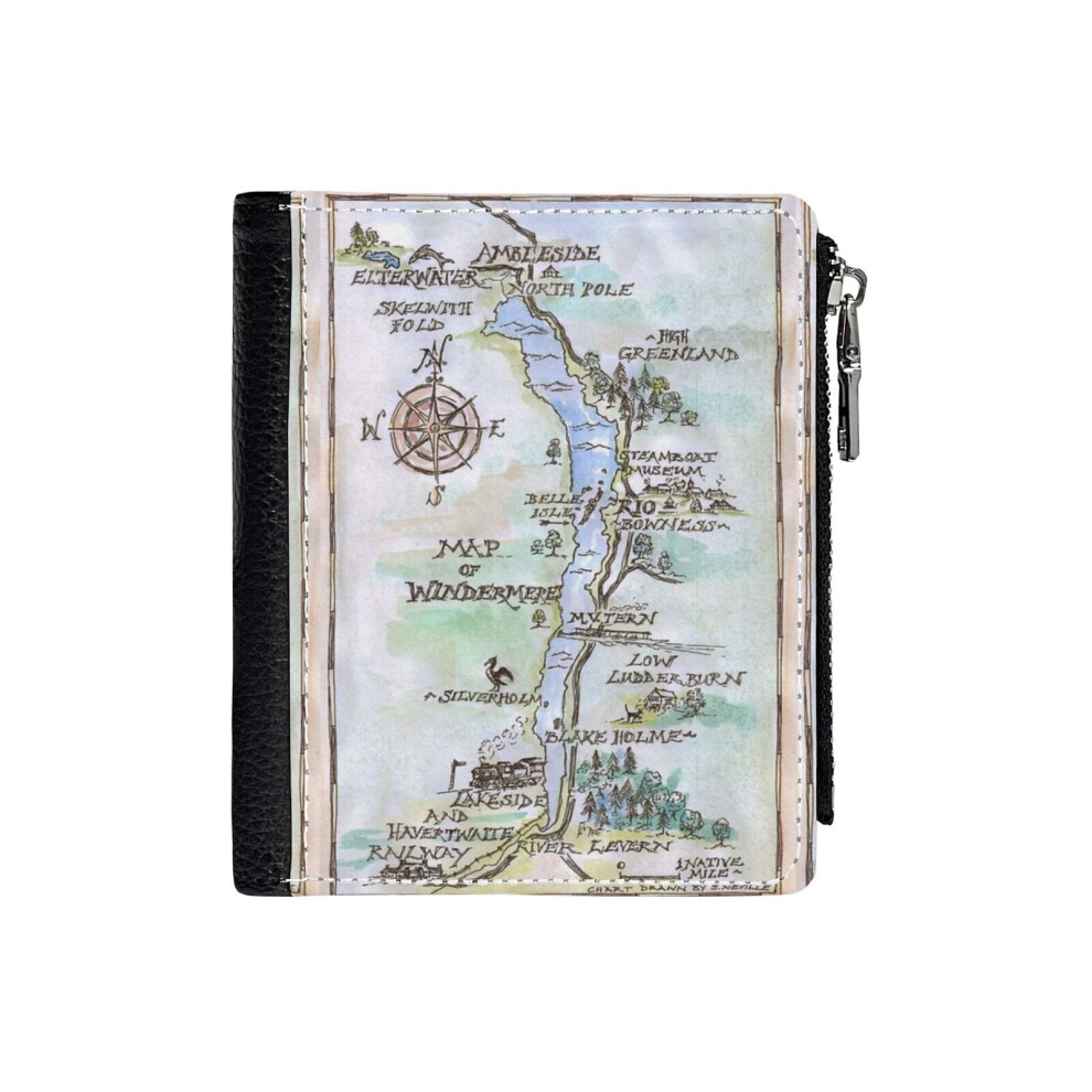 (Swallows And Amazons Map Of Windermere In Spring Colours - _142) PU Wallet Compact Bifold with Zipper & Multiple Card Coins Slots Black Stylish Durab