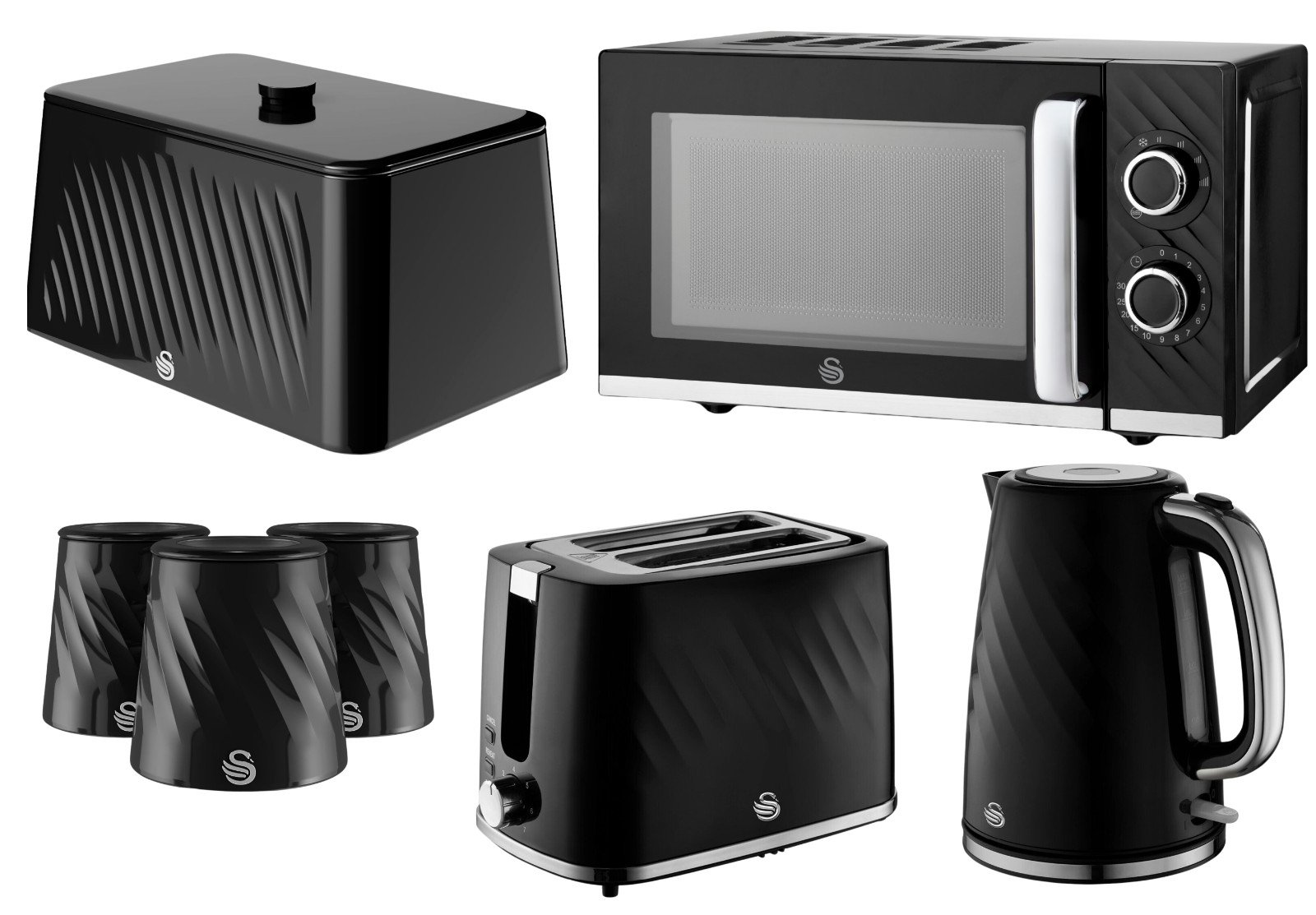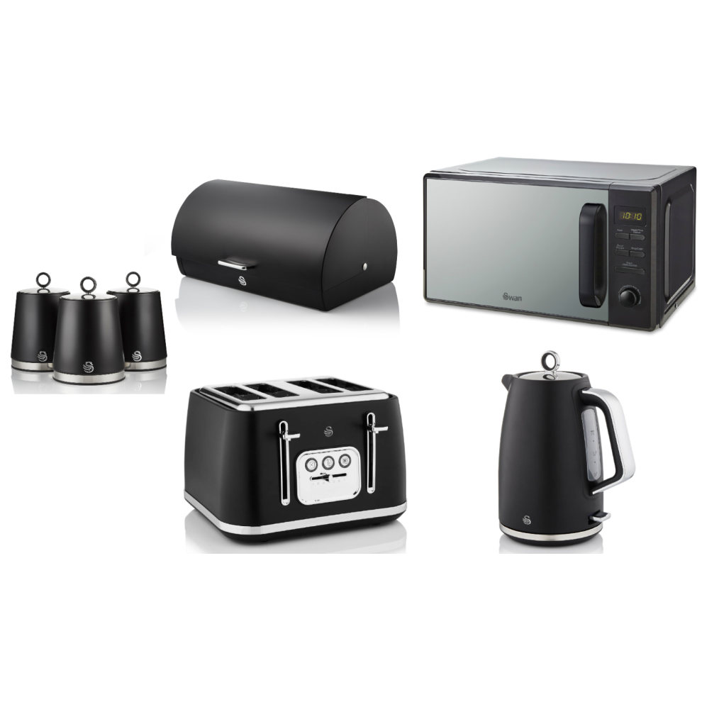 Swan Solace Black Kettle Toaster Microwave Breadbin & Canisters Kitchen Set