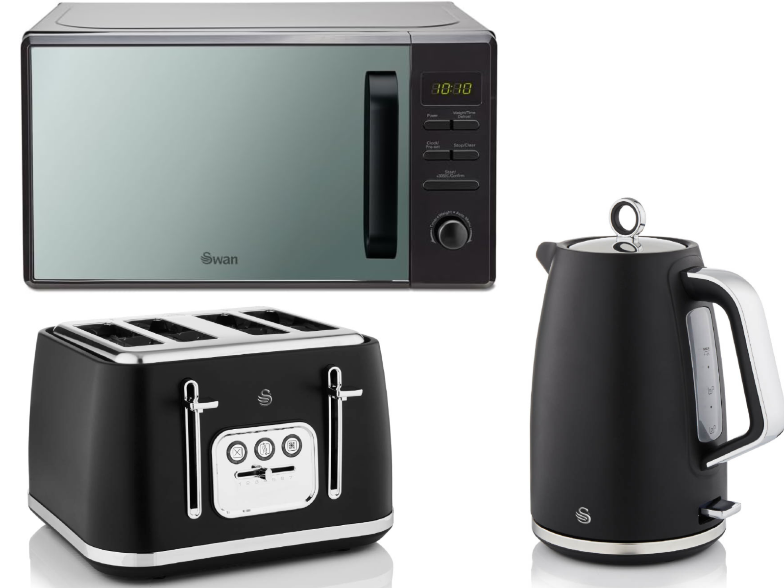 Swan Windsor Black Kettle Toaster Microwave Set Textured Finish Chrome Accents