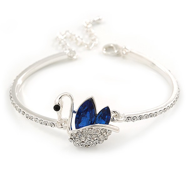 Exquisite Clear Crystal, Blue CZ Swan Bracelet In Rhodium Plating - 18cm L/ 5cm