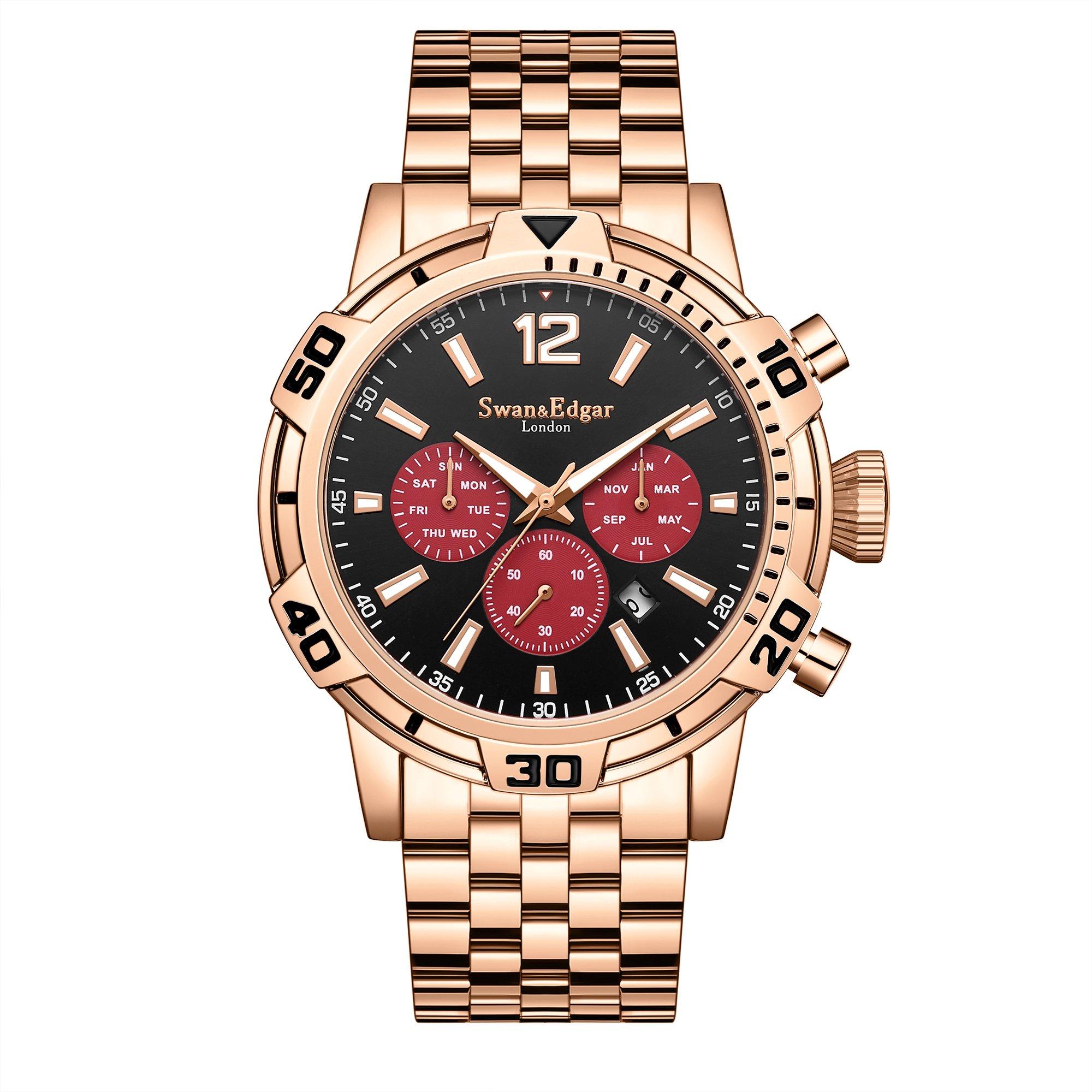 Swan & Edgar Ambassador Chronograph Designer Mens Mechanical Quartz Watches Men with Saphire Glass & Gold Black Dial, Tonneau Shape Hand Assembled 12 Hour Analogue Mens Watch - Rose Gold Black