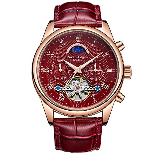 SWAN AND EDGAR Complexity Designer Mens Automatic Watch with Sapphire Crystal, Day, Date & Business Quarter, Leather Strap, Water Resistant 30M, Analogue Mens Watch - Red
