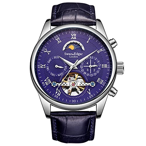 SWAN AND EDGAR Complexity Designer Mens Automatic Watch with Sapphire Crystal, Day, Date & Business Quarter, Leather Strap, Water Resistant 30M, Analogue Mens Watch - Blue