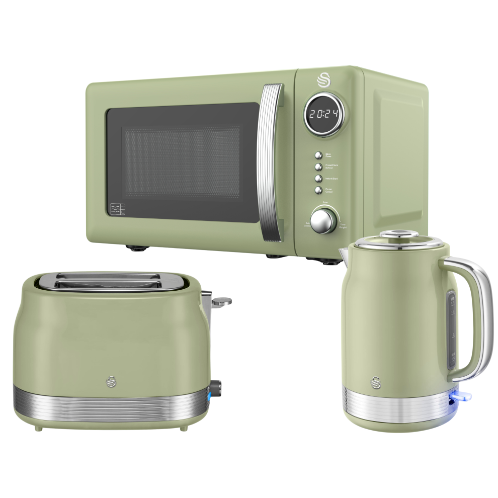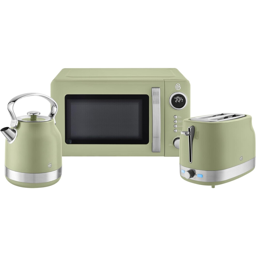 Swan Retro Revive Green Kitchen Appliance Bundle – 1.7L Rapid Boil Kettle, 2 Slice Toaster & 800W 20L Digital Microwave, Retro Gloss Finish with Chrome Accents