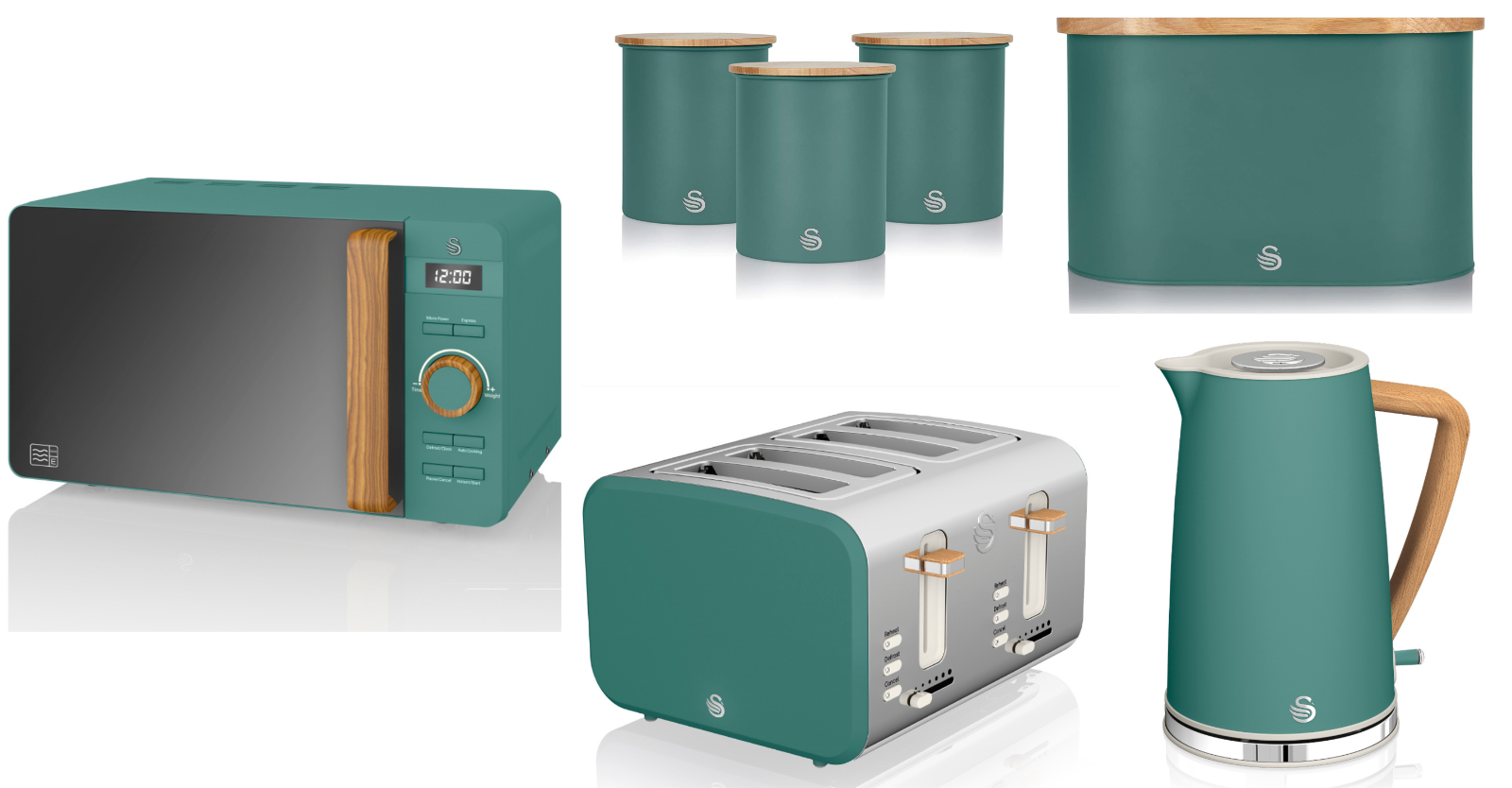 Swan Nordic Green Kettle 2 Slice Toaster Microwave & Canisters Set of 6