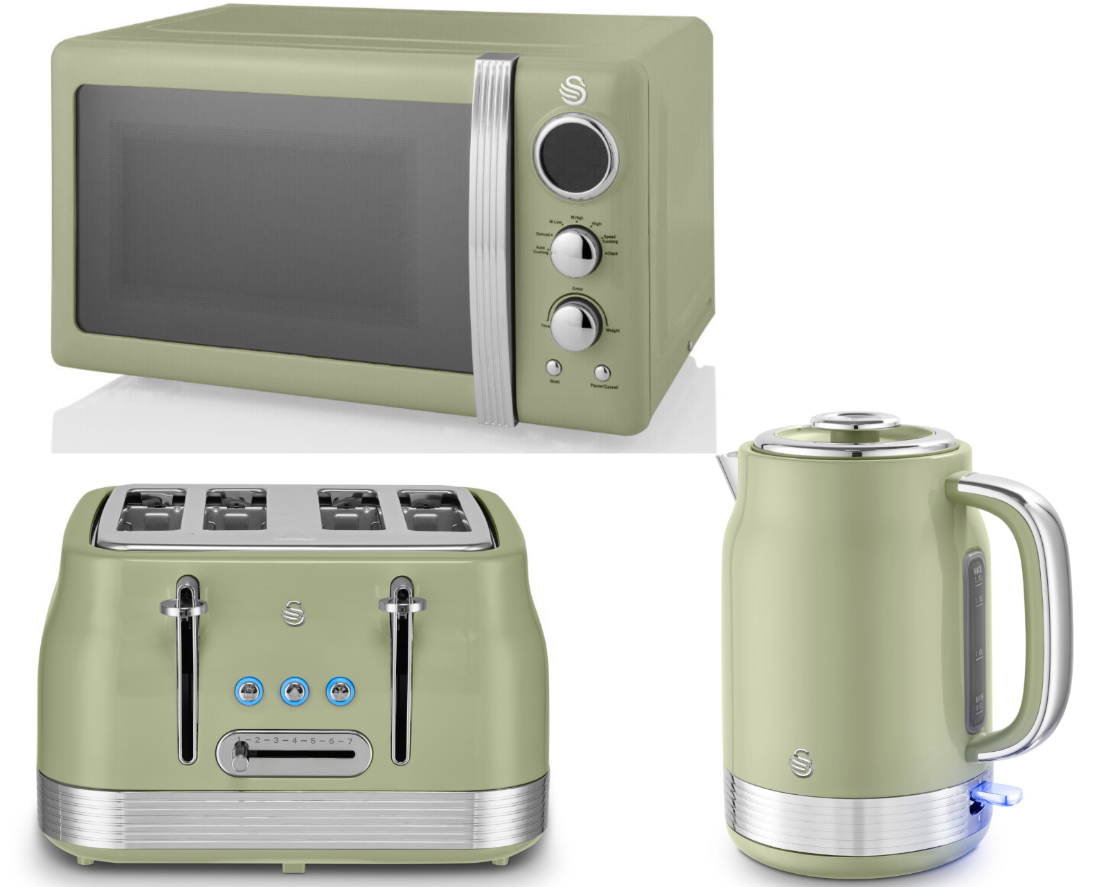 Swan Retro Revive Green 1.7L 3KW Jug Kettle, 4 Slice Toaster & Retro 800W 20L Microwave. Matching Vintage Design Kitchen Set in Green with Chrome Accents