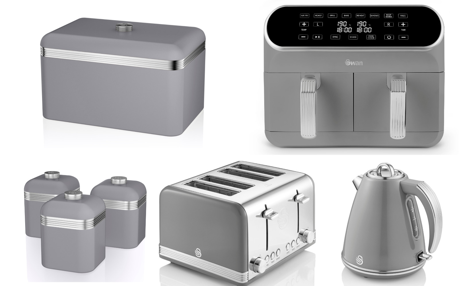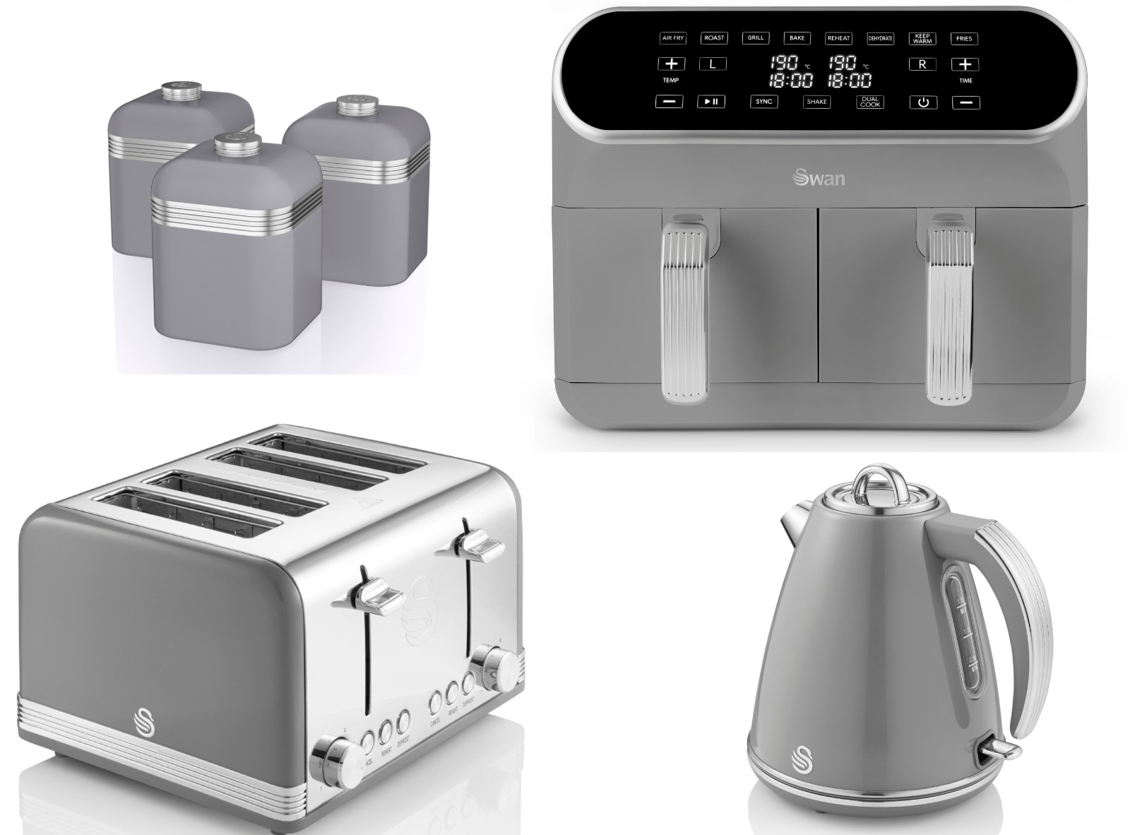 SWAN Retro Grey Kettle Toaster Dual Basket Air Fryer Bread Bin & Canisters Set