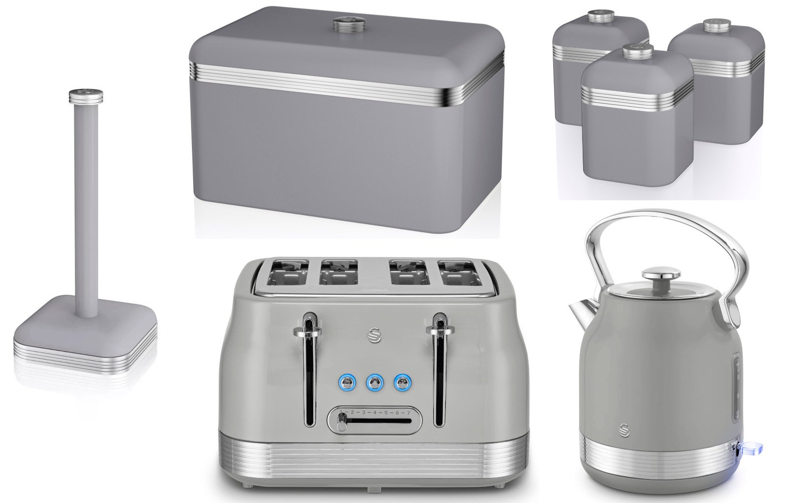 Swan Retro Revive Grey Kettle Toaster Breadbin Canisters Kitchen Roll Holder