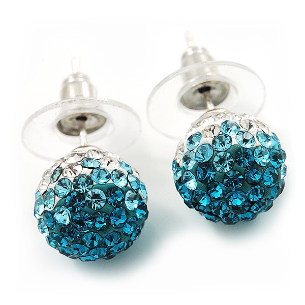 Teal/Light Blue/Clear Swarovski Crystal Ball Stud Earrings In Silver Plated