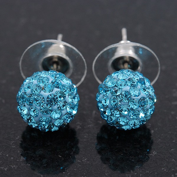 Light Blue Swarovski Crystal Ball Stud Earrings In Silver Plated Finish - 9mm