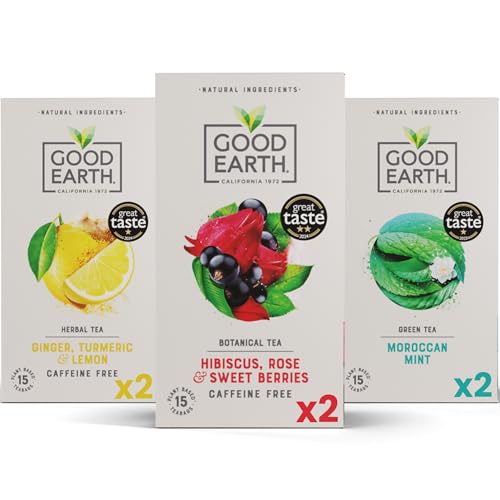 Good Earth Tea Co. Variety Pack - 6 Box Gift Set of Herbal, Fruit & Green Tea Featuring Moroccan Mint, Hibiscus, Sweet Berries & Rose and Ginger, Turmeric & Lemon Tea Bags - 90 Plant-Based Teabags