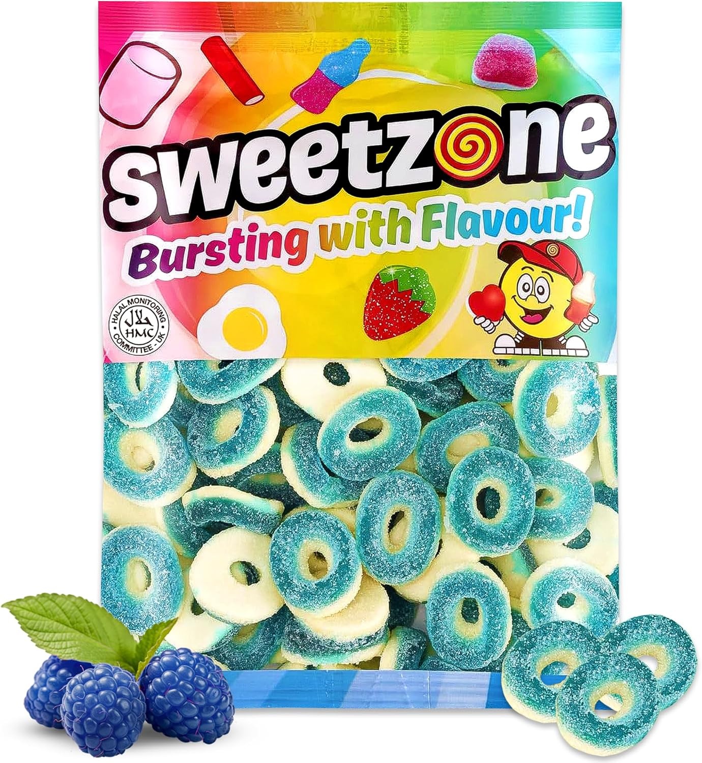 Sweetzone (Blue Raspberry Rings 1KG Bag - 1F005) Halal Sweets Party Mix, Fizzy Cherry Bottles, Mix 1kg HMC
