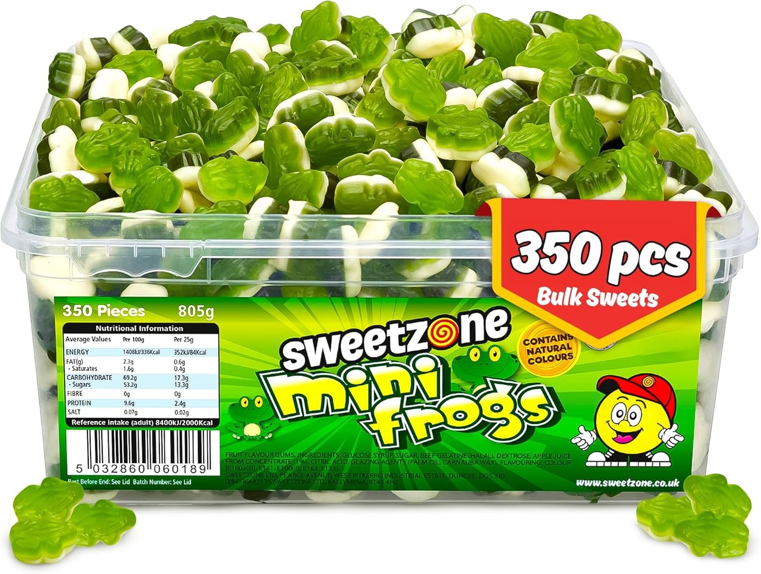 Sweetzone (Mini Frogs 800g TUB - 1H036) Halal Sweets Cola Bottles, Sour Suckers, Twin Cherries Tubs HMC Certified