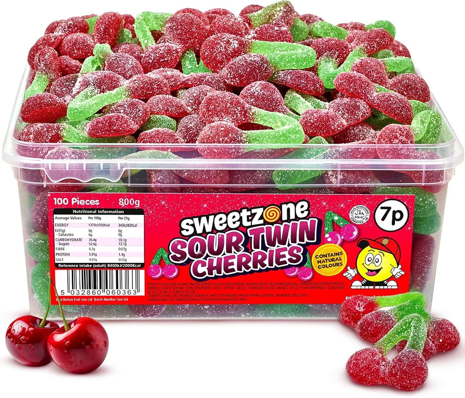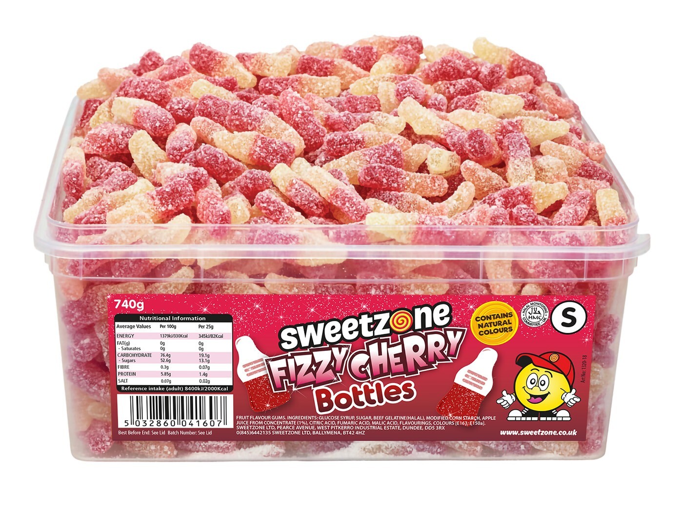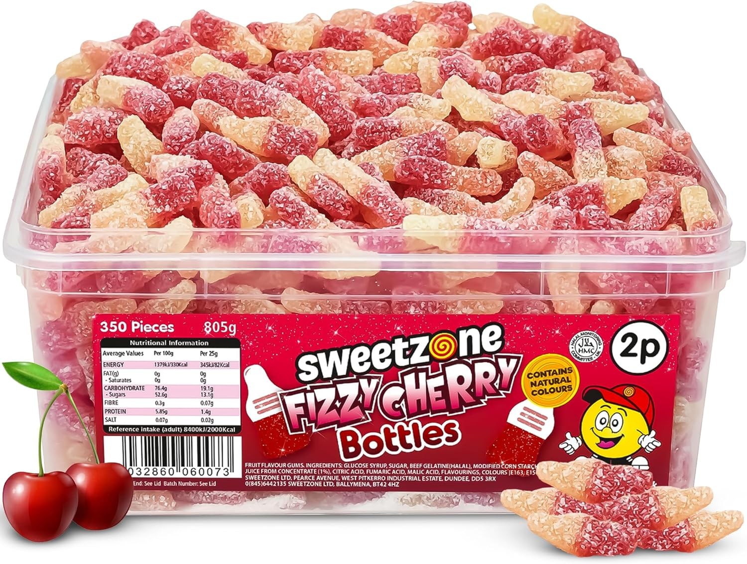 Sweetzone (Fizzy Cherry Bottles 800g TUB - 1H013) Halal Sweets Cola Bottles, Sour Suckers, Twin Cherries Tubs HMC Certified
