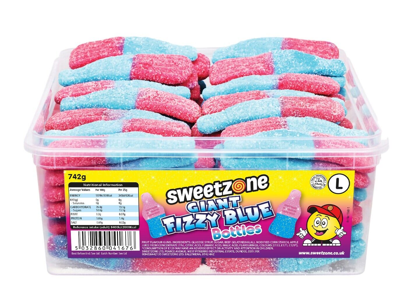 Sweetzone (Fizzy Blue Raspberry Bottles 800g TUB - 1H003) Halal Sweets Cola Bottles, Sour Suckers, Twin Cherries Tubs HMC Certified
