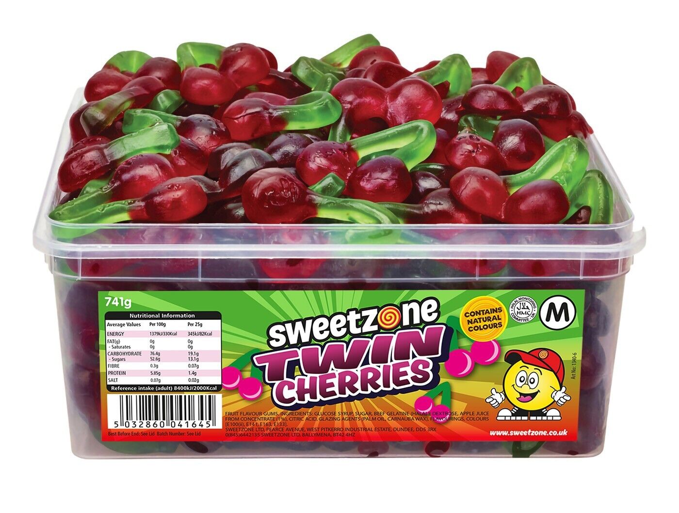 Sweetzone (Fruity Hearts 800g TUB - 1H027) Halal Sweets Cola Bottles, Sour Suckers, Twin Cherries Tubs HMC Certified