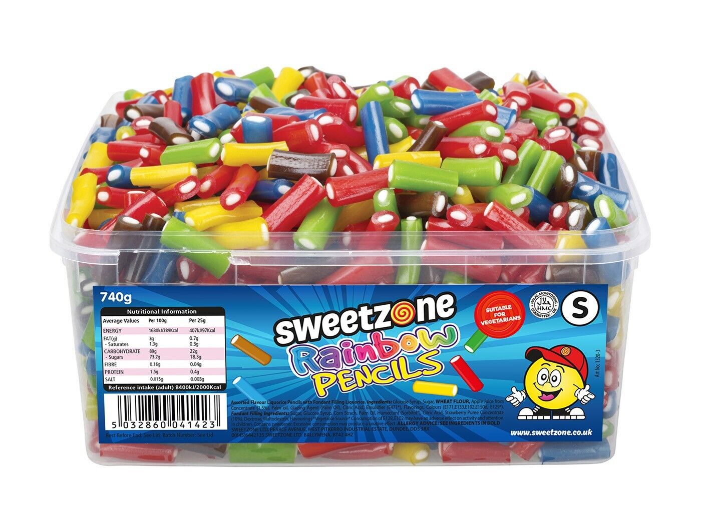 Sweetzone (Rainbow Pencils 800g TUB - 1H041) Halal Sweets Cola Bottles, Sour Suckers, Twin Cherries Tubs HMC Certified