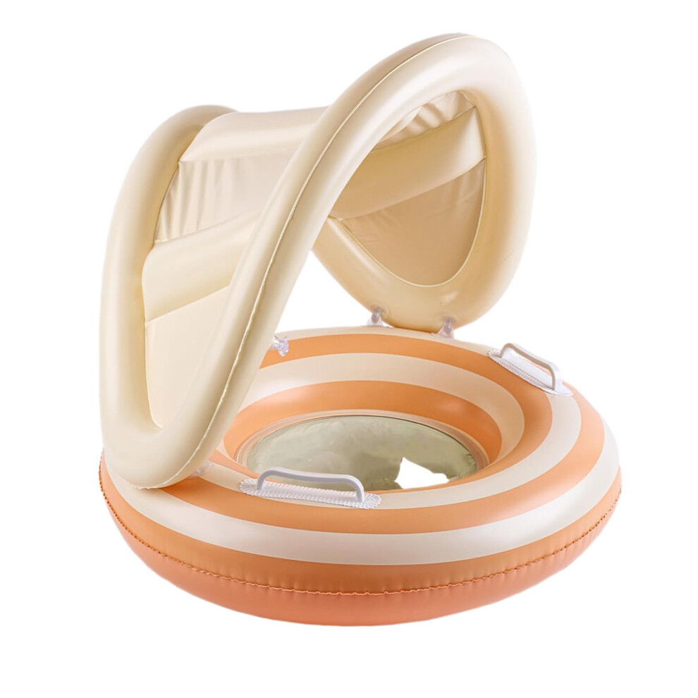 Baby swimming float, toddler seat ring, adjustable swim ring with sunshade as a swimming aid for infants during outdoor water fun, orange.