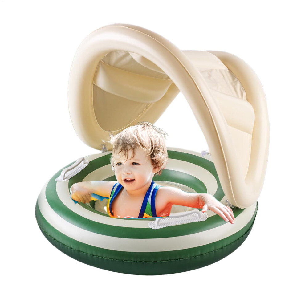 Baby Pool Floating Ring with Removable Sunshade - Inflatable Safety Swim Ring for Infants, Quick-Fold Design, Green Striped