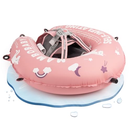 HECCEI Baby Swimming Float for 3-24 Months, Mambobaby Self-Inflating Toddler Pool Float with Carry Bag, Anti-Flip Design Baby Swim Ring for Infants and Toddlers (Pink)