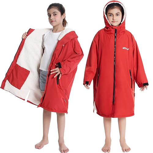 Hiturbo Kids Waterproof Changing Robe: Windproof Warm Swim Robe Oversized Surf Coat with Thick Fleece Lining Red