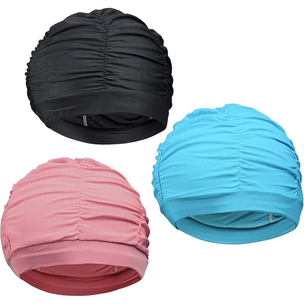 3 Pack Pleated Swimming Caps for Long Hair, Not Waterproof