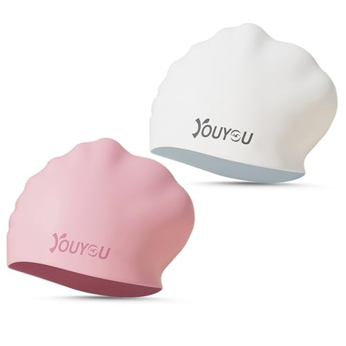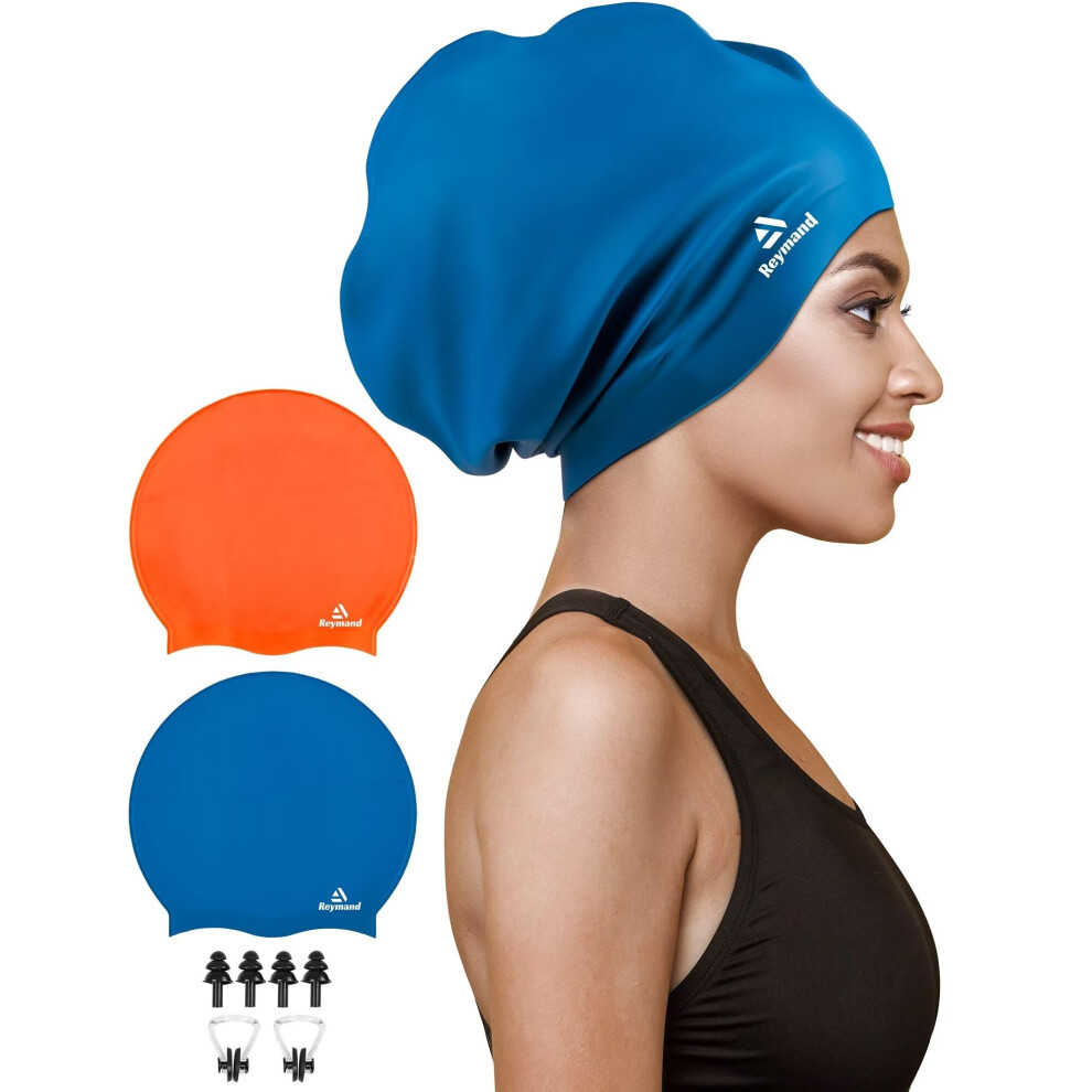 2 Pack Silicone Swimming Caps for Long Hair, Large Waterproof Swimming Caps for Women Men Adults with Thick or Curly Hair, Comfortable 3D Bathing Caps