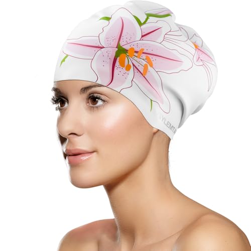 SYLEMTAM Swim Cap Women, Silicone Swimming Caps for Long Hair Anti Slip Waterproof Swim Caps for Womens Adult, Comfortable Bathing Cap Swimming Hats Fit for Curly Short Medium Long Thick Hairs (Lily)
