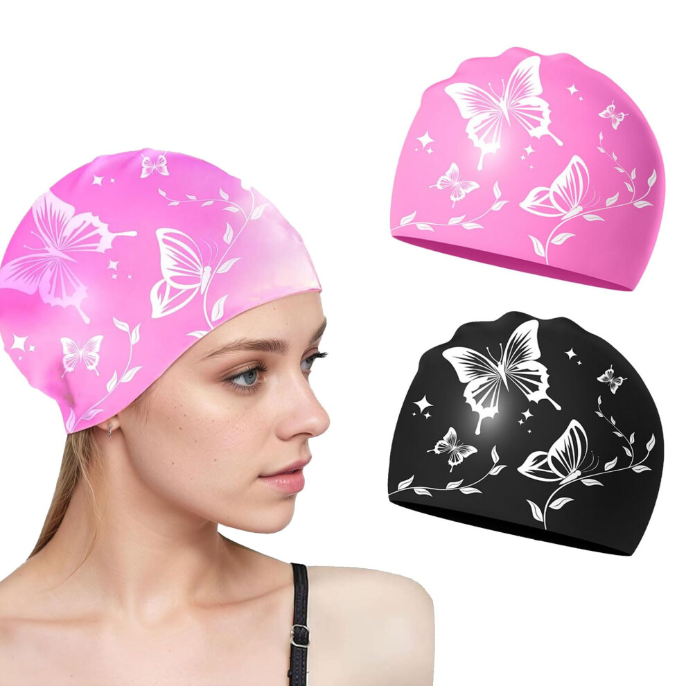 Pack of 2 Swimming Caps for Women, Long Hair Women's Silicone Swimming Cap,, Elastic, Stylish, Comfortable (Black Pink)