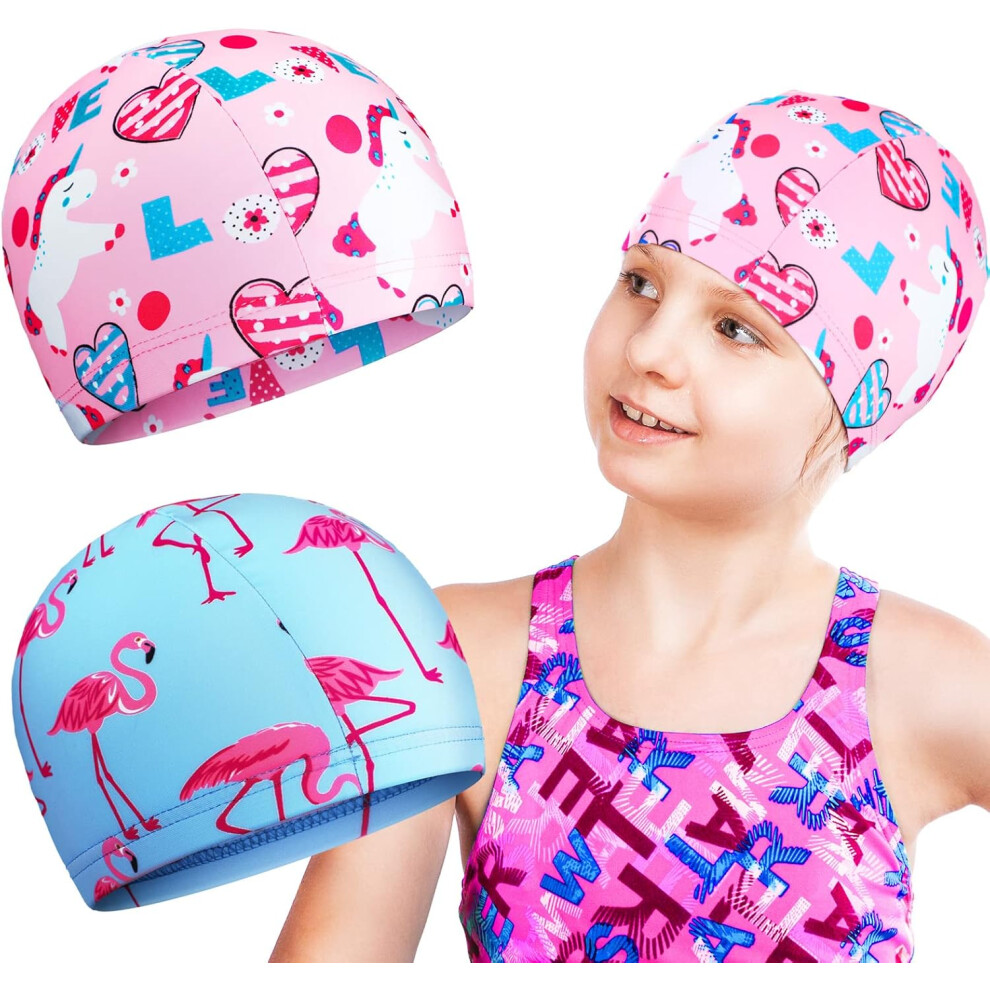 Set of 2 Kids Swimming Caps Girls Swimming Caps Fabric Toddler Swimming Caps Polyester Kids Swimming Caps Long or Short Hair Kids Swimming Caps