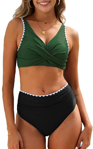 CheChury Womens High Waisted Bikini Set Tummy Control Push Up Bikini Padded V-Neck High Waist Bikini with Border Swimming Costume Women 2 Piece Swimsuit Bathing Suit for Women Swimwear,Green,S