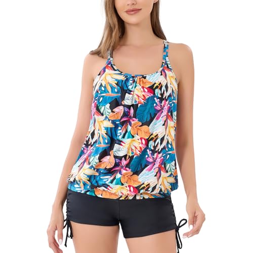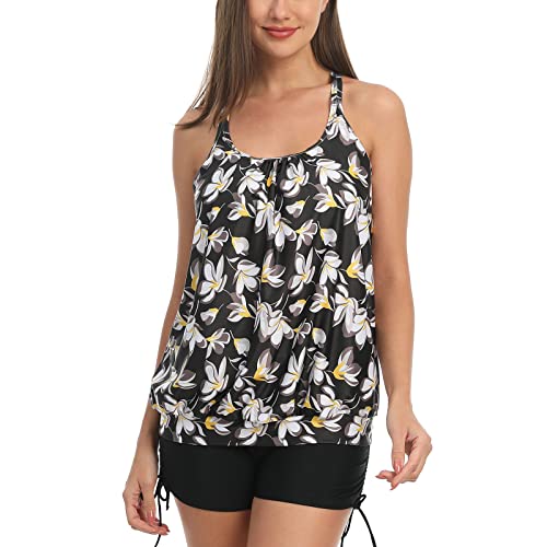IHCEMIH Swimming Costume Women Tankinis Sets Push up Tummy Control High Waisted Swimwear Swimsuits Bathing Suit Beach Wear Women's Two Pieces Floral Blouson Tankini with Black Shorts for Ladies M.