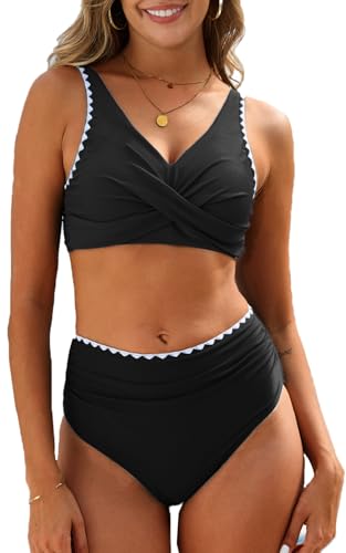 CheChury Womens High Waisted Bikini Set Tummy Control Push Up Bikini Padded V-Neck High Waist Bikini with Border Swimming Costume Women 2 Piece Swimsuit Bathing Suit for Women Swimwear,Black,S
