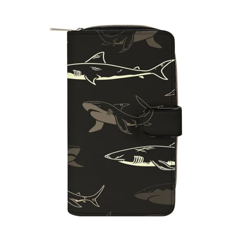 Vintage Retro Swimming Sharks on Dark Long Clutch Wallet, Long Handbag with Removable Wristlet Strap, PU Leather Zip Purse, Credit Pass Case Card-Holder for Men Women