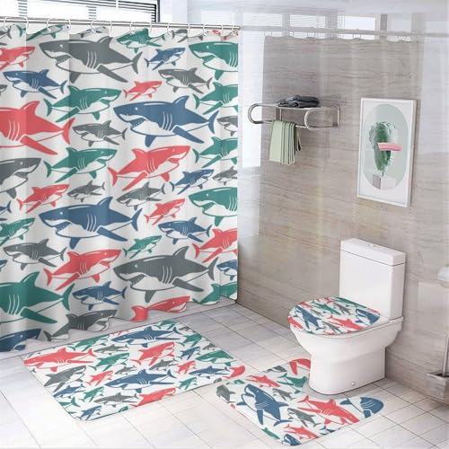 Nugier Bath Curtain with Rug(Toilet Lid Cover Mat, U Shape Mat, Bath Mat) with Hooks 4 Pcs Shower Curtain with Matching Doormat Sets, Print Grey Blue Green Red Swimming Sharks Seamless on White
