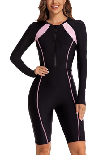 ECUPPER Womens One Piece Rash Guard Zip Up Swimsuit Long Sleeve Boyleg Athletic Surf Swimwear Short Wetsuit Built in Bra Black-4 Medium