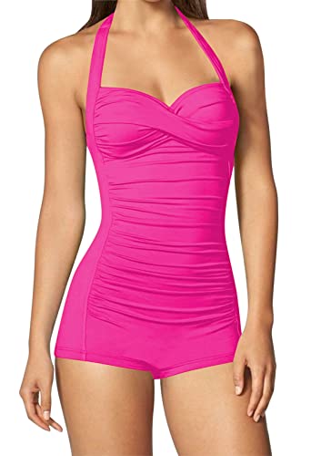 Women's 1 Piece Swimsuit Tummy Control Boyleg Boyshort Rretro Bathing Suit Rose Red, Medium