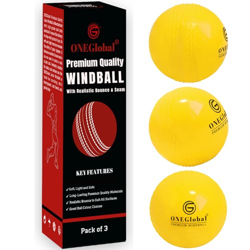 ONEGlobal Premium Windball Soft Cricket Ball | Durable, Embossed Seam, True Bounce & Swing | Wind Ball Cricket Balls for Outdoor & Indoor Practice, Coaching, Garden & Beach Games (3-YELLOW)