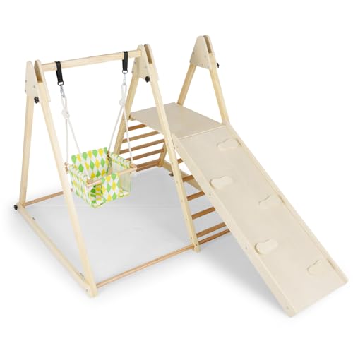 Maxmass Kids Climbing Frame, Wooden Children Climber Playset with Swing, Ladder, Garden Toddler Jungle Gym Playground for Indoor Outdoor (with Climbing Ramp: 120x185x115cm, Natural)